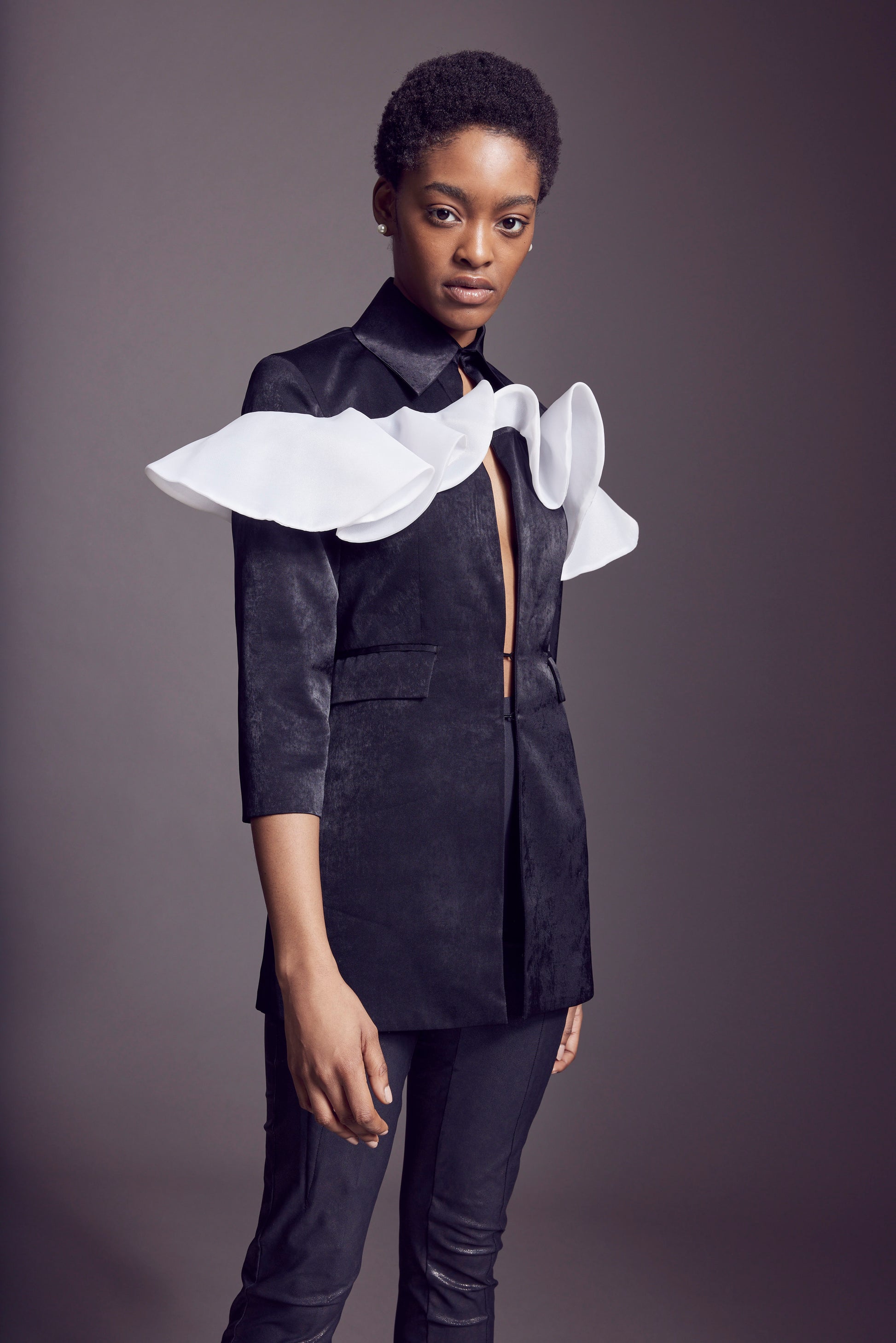 Make your mark on the style scene with our Ruffle Jacket. Adorned with ruffles along the front, this piece will make a style statement worth remembering. Black cady fabric forms long sleeves with a collared neckline and front open design that is both classy and sexy. Pockets with flaps are placed on each side of the jacket.