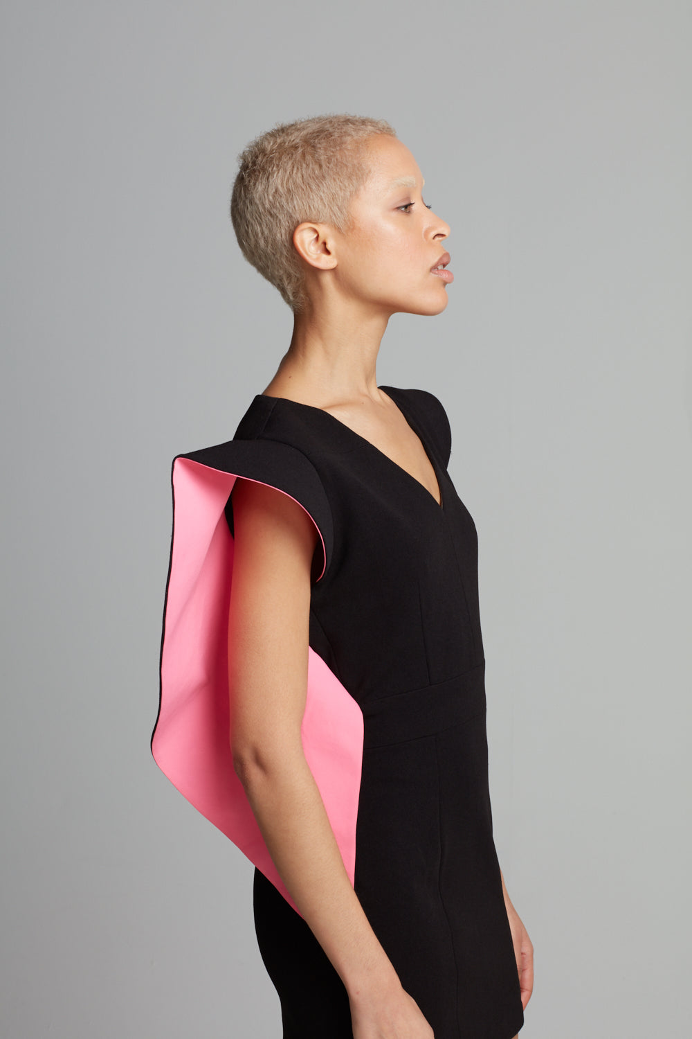 Our Flap Dress is a beautifully exaggerated sleeve treatment created from extended shoulders that fold into a flap at the back, to expose a delectable, pink interior. This is a dress for the fiercely creative woman. In black and pink.